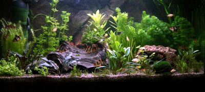 Das Aquarium ist mit verschiedenen, schnellwachsenden Pflanzen bestückt und läuft mit einem Eheim-Aquaball-Innenfilter. Der Innenfilter hat 3 Kammern die mit Granulat und Schwämmen bestückt sind.